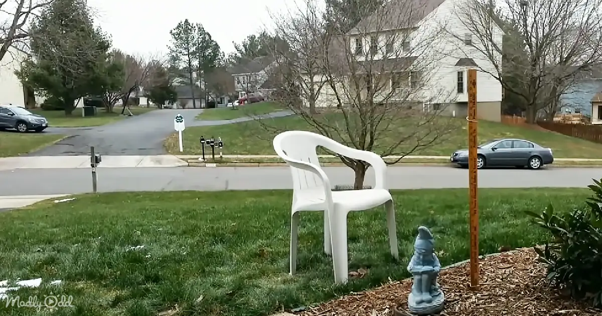 This camera is programmed to capture one frame every 30 seconds. The footage is then compressed into a short video. It begins on a normal morning with cars driving past and a white chair on the porch.