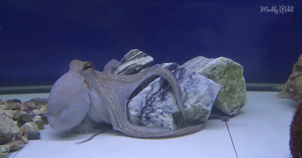 The two cephalopods seem to be having a lot of fun in their new habitat. They instantly take up playing with one another. The cuttlefish has her turn first. She hides behind some seaweed in one corner of the tank, and the octopus finds her. The cuttlefish then swims away and hides behind some rocks in the opposite corner of the tank.
