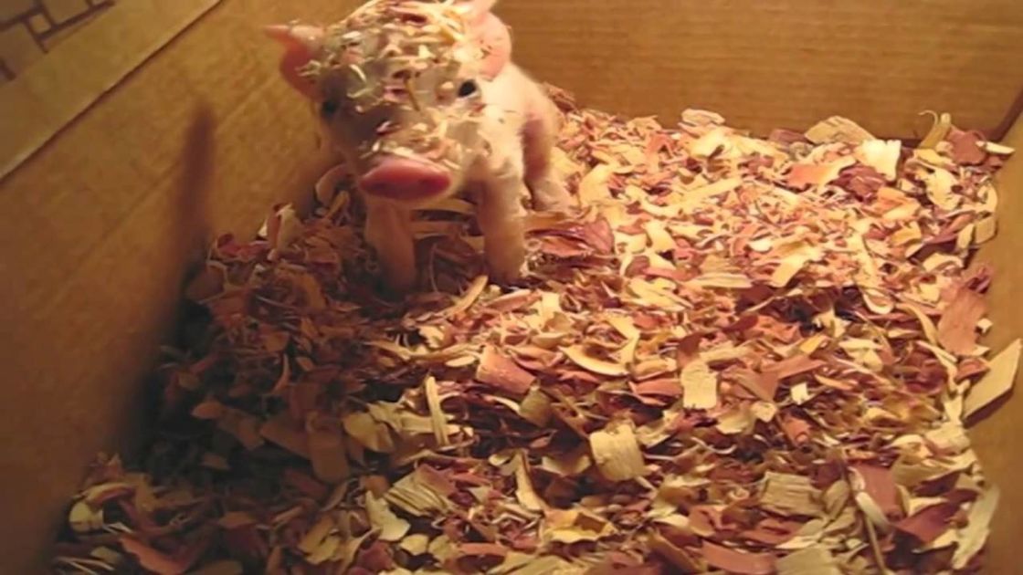 This short, but OH SO CUTE, the video shows a woman walking into a room where she has a piglet in a box, with a heat lamp. The wee little piglet is asleep with her head in wood chips. The noise awakens her, with chips still on her head. There’s no pause for him to collect herself.