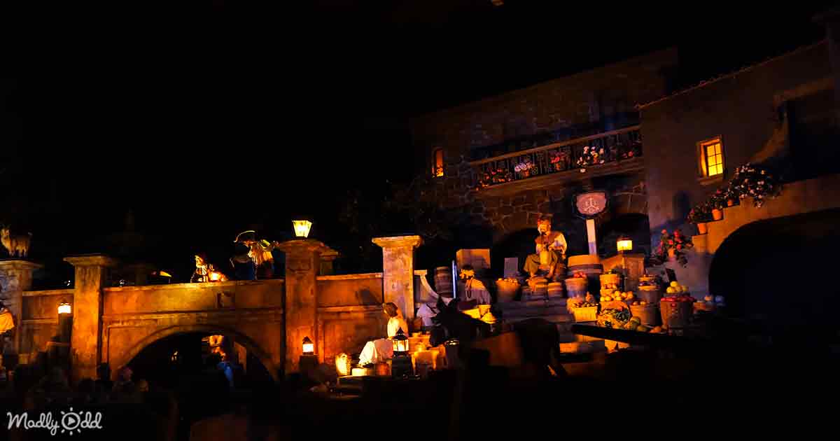In only 8.5 minutes, the audience watches the story of Captain Jack Sparrow and his nemesis Barbossa with 125 audio-animatronics figures, with 65 pirates and villagers and 60 animals and birds.