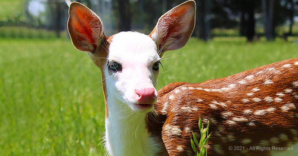 The fawn has albinism which results in a lack of pigments. He has blue eyes, pale skin, and a weak immune system. The Mother took this situation adversely and abandoned his baby.