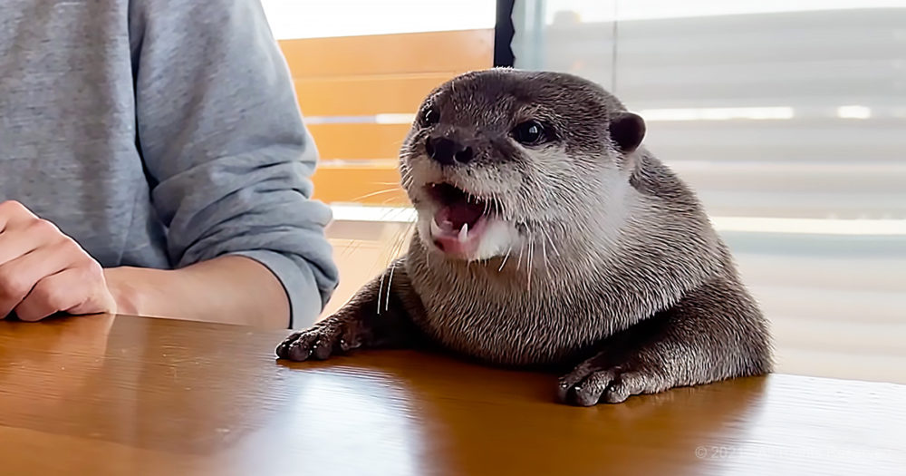 A young otter provided a delightful moment during lunchtime with her human friends. When they began eating, she jumped onto the table to observe.