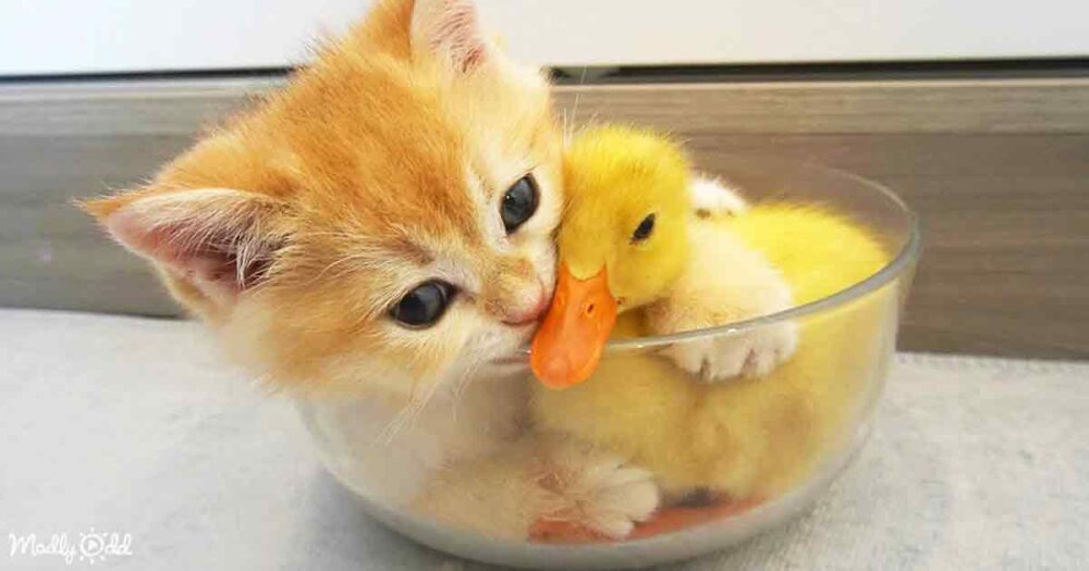 In nature, cats hunt ducks, but these two could not be closer. We mean that statement quite literally. The two tiny babies squished themselves together in a small glass bowl.