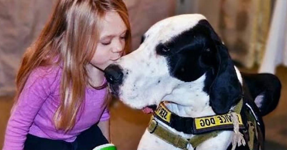 But then a gigantic black-and-white Great Dane named George came into Bella’s life, changing it forever. When they met, they bonded almost instantaneously. As one of the Service Dog Project’s trainers recalled, “One day, Bella climbed up with George and she just started talking to George and next thing you know, his head is in her lap and he’s just looking up at her like she’s the best thing in the whole world.” Bella herself summarized it beautifully: “I could tell he needed me and I needed him.”