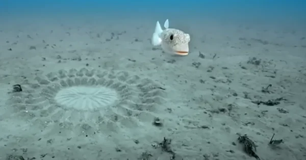 Narrated by the legendary David Attenborough, a captivating clip from the PBS series “Big Pacific” reveals the ingenuity of the male pufferfish. With relentless determination, he sets out to create a masterpiece that will sweep potential mates off their fins.