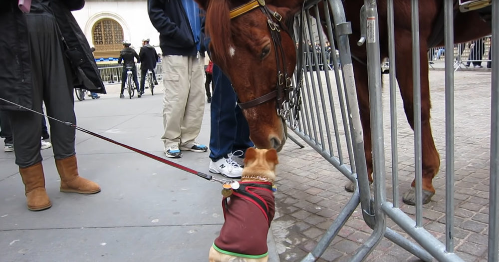 Tiny French Bulldog Can’t Contain Her Excitement While Meeting Giant Police Horse