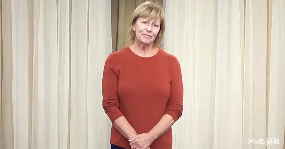 First up in this makeover challenge is Robin from Ohio. She’s 65 years old with shoulder-length strawberry blonde hair and a pinkish hue to her skin. Robin wears all black before her transformation. She says she hopes to feel striking, distinctive, and gorgeous. She comes through the curtain looking just that.