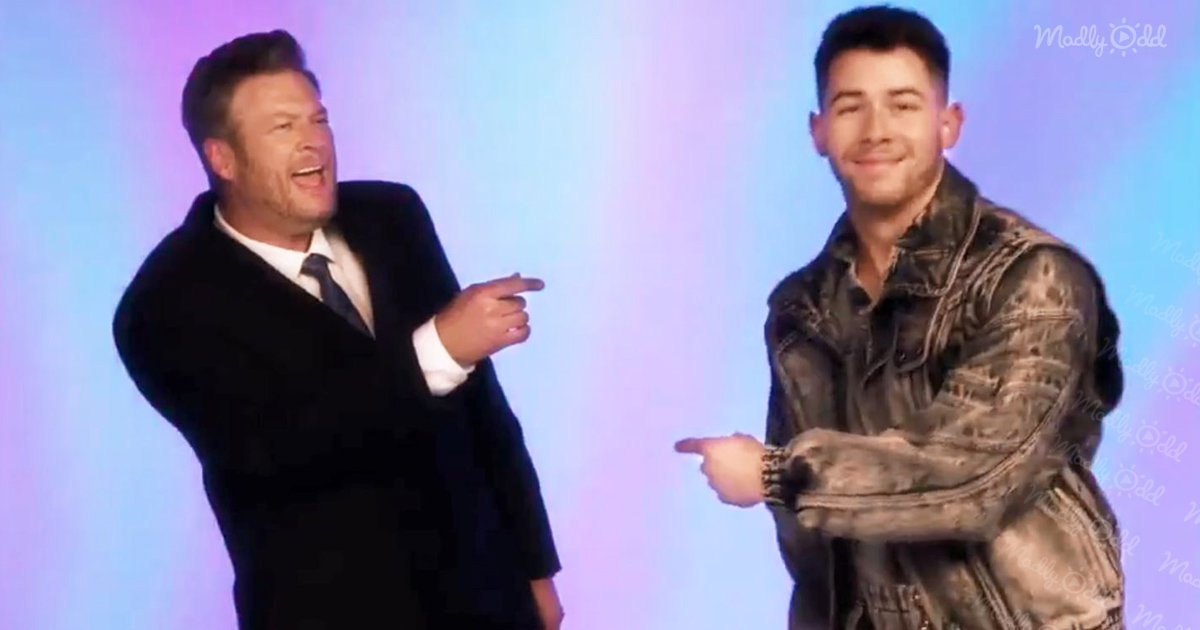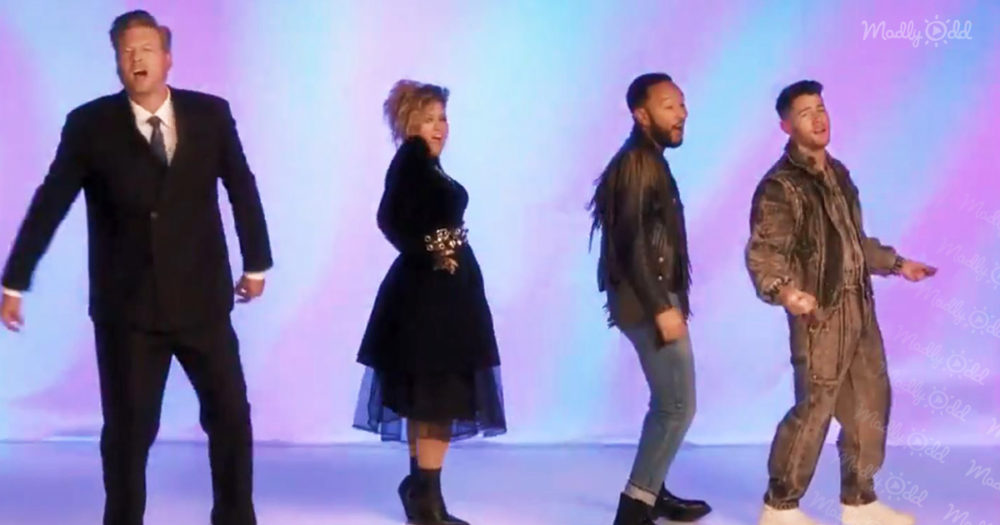 In this 80s inspired video, they sang Rick Astley’s “Together Forever.” Blake Shelton begins by going at pictures of his fellow coaches. The four stars wore outfits from the 1980s.