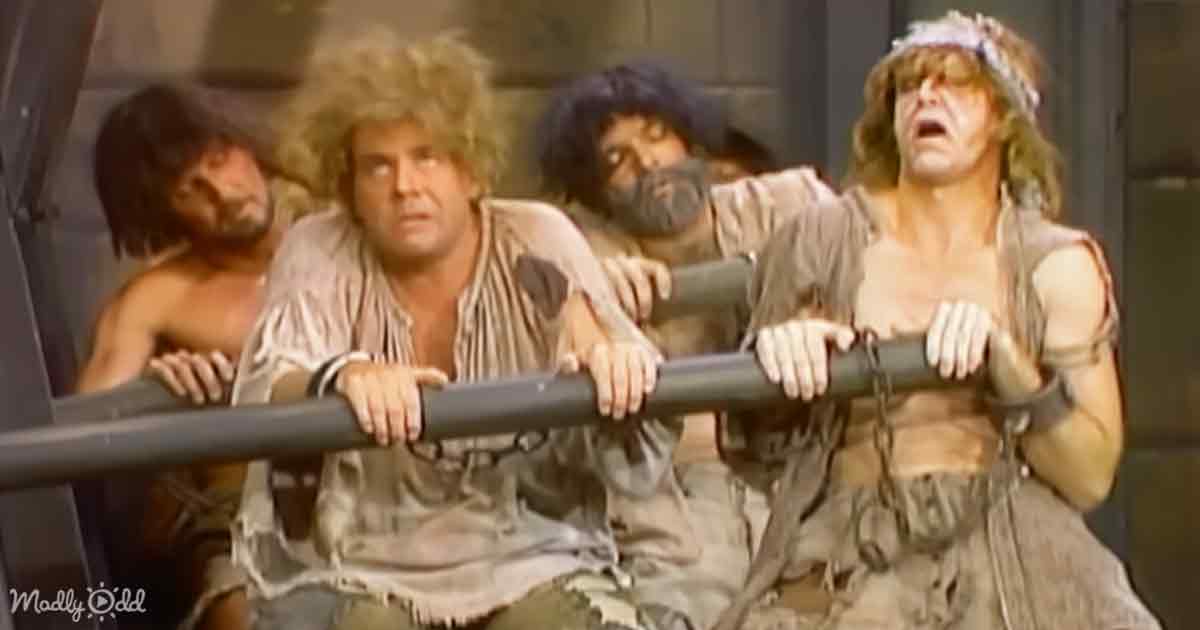 The interaction between Davis Jr. and Conway is humorous from the get-go, particularly when Bruce critiques Tim’s attire, & then remarks cheekily about his window seat while rowing the ship. Davis Jr.’s character (Bruce) doesn’t stop there; his flamboyant quips keep coming even when Korman reappears, sternly demanding they row properly.