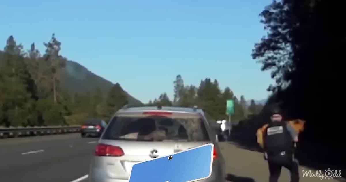 On Silver’s vehicle, the dashboard camera caught the moment the dog hopped out and into the trooper’s arms. He let the driver and canines go, leaving them with only a warning.