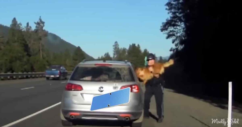 During a traffic stop on a highway, Trooper Silver caught a dog that jumped out of the car. He was right by the window and quickly grabbed the large canine in his arms.