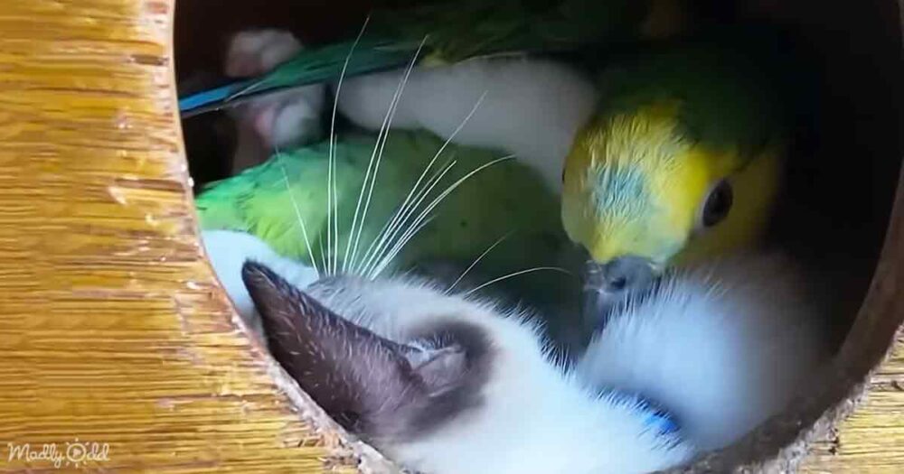 Humans can learn a lot from animals, as the most unlikely friendships can form between different species. An adorable lilac point kitten and a gorgeous yellow-headed Amazon parrot are together in a birdhouse, cuddling up and keeping each other warm. They look so cozy and snuggly, and they are precious.