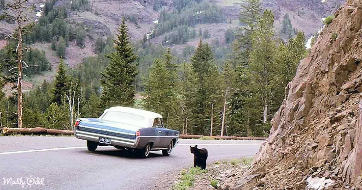 One photo shows a 1963 Pontiac driving on the mountainside while a bear cub walks along the side of the road in step with the vehicle. Another road trip photo is from Mariposa Grove in Yosemite National Park from 1950. The scenes show multiple family cars and a pick-up truck parked in front of a huge tree that hides a cabin and a trail.