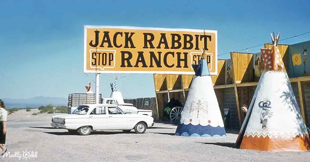The family road trip also visited Jack Rabbit Ranch in New Mexico in 1960. A single car parked outside at a roadside stop with old Native American-style tents fills the frame