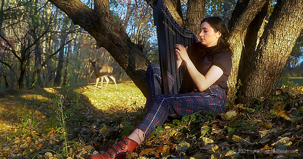 She plays the song “The Sound of Silence.” The soft notes attract the attention of a small deer. Curious, the deer slowly approaches the harpist.